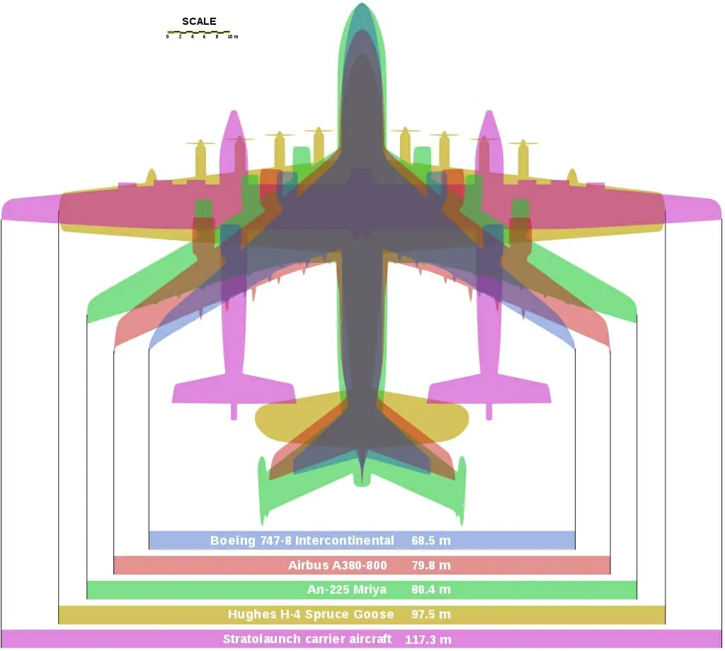 Someone will surely comment that there were larger planes. For example, the Hughes H-4 Hercules The Spruce Goose, which took off for its single flight in 1947, had a wingspan of 97.82 m. However, it wasn’t a commercial plane and it has flown only once. The wingspan of the Scaled Composites Stratolaunch is even more impressive – 117 meters. However, this prototype of the double fuselage aircraft has a very specific purpose (spacecraft launch) and it flew only a few times after its 2019 maiden flight. The Scaled Composites Stratolaunch is more of a prototype than a commercial plane. The An-225 Mriya was heavier, longer and more useful than these other large planes as well.