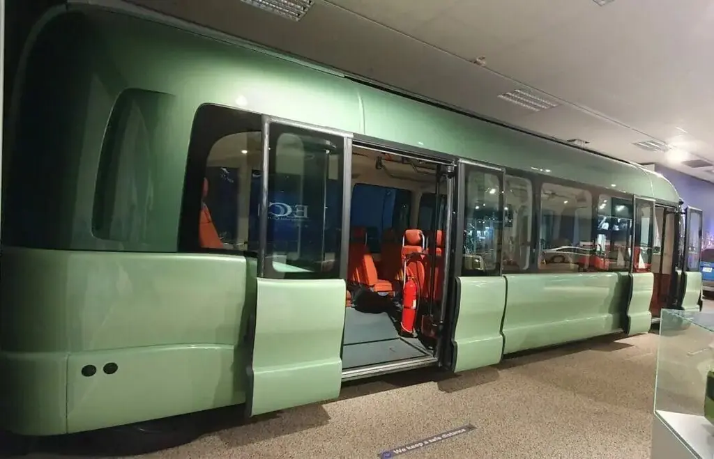 The low‑floor Volvo ECB featured a unique body made mostly from aluminum. Its core structure was a rigid safety frame, similar to a racing car’s roll cage, designed to protect passengers in a crash. The seats were mounted directly to this frame, and in the event of a rollover, an emergency exit in the floor would allow passengers to escape. Normally, evacuation from an overturned bus happens through roof hatches, but the ECB’s ceiling was packed with equipment.