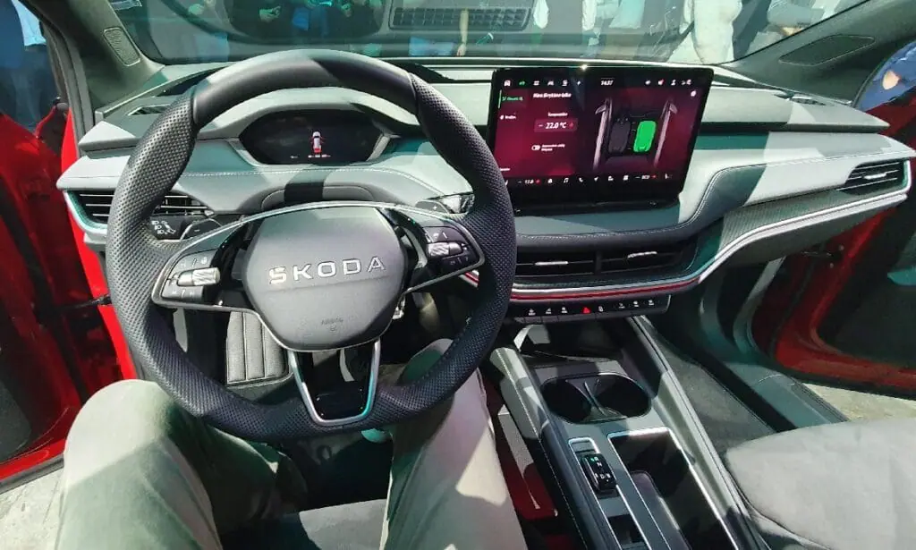 There is no regular Škoda logo on the Elroq’s surprisingly sleek nose, nor on the boot lid. It can be seen on the rims and the umbrella handle, but those parts can be changed. The traditional Škoda’s winged arrow is in the shadow. Even the steering wheel is not decorated with an old-school round logo.